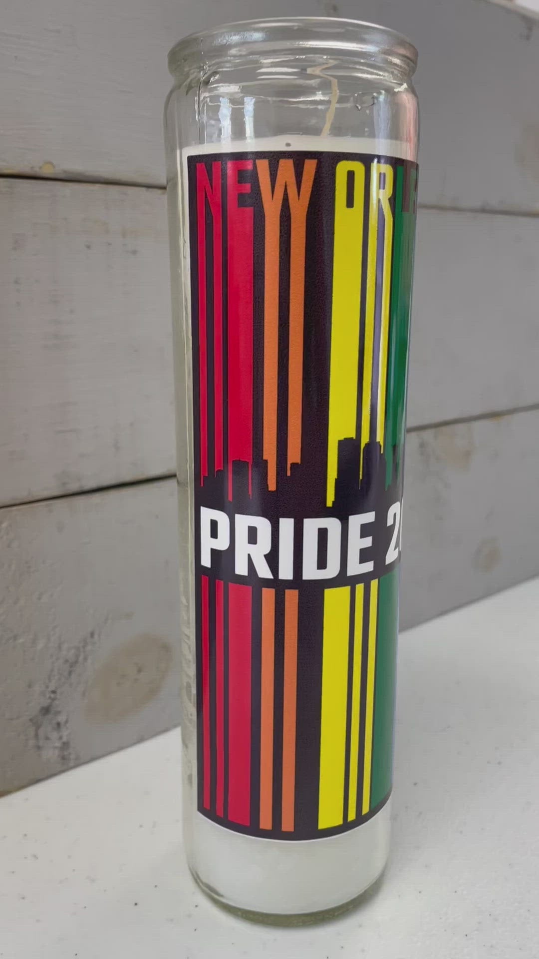 Tall white altar/ prayer candle featuring the New Orleans Pride.